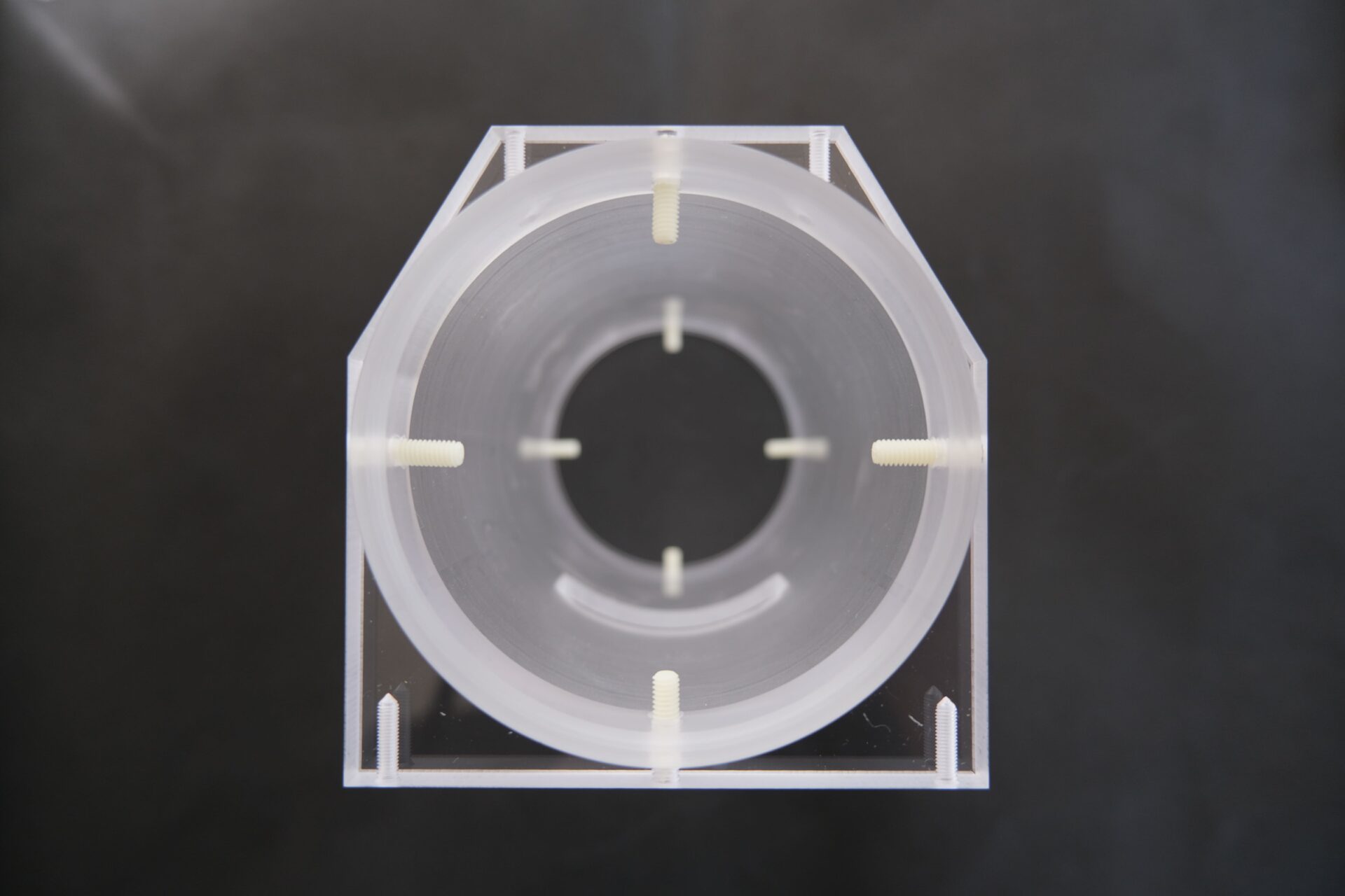 高い透明度と寸法精度が要求される構造で、旋盤による精密切削から組立・確認までを自社で一貫対応しました。