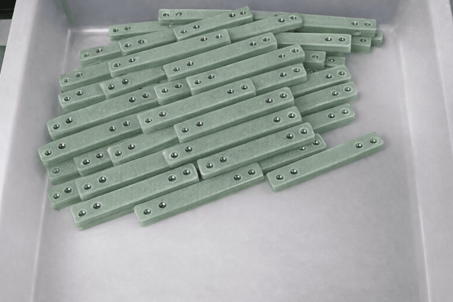 板材のガラスエポキシを使用し、同一形状の部品をまとめて製作する量産対応案件として対応しました。