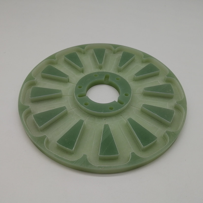 本製品は、ガラス繊維を含むガラスエポキシ材(GFRP)を使用した円盤形状の加工品です。